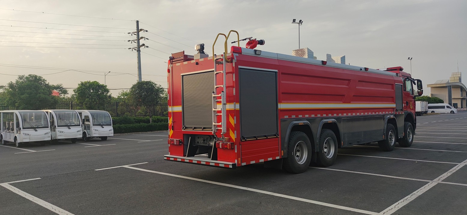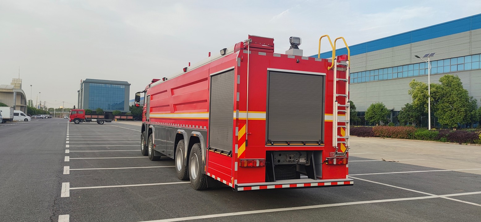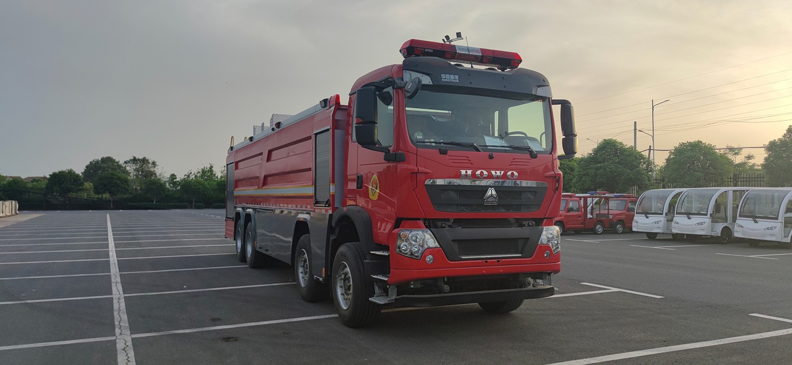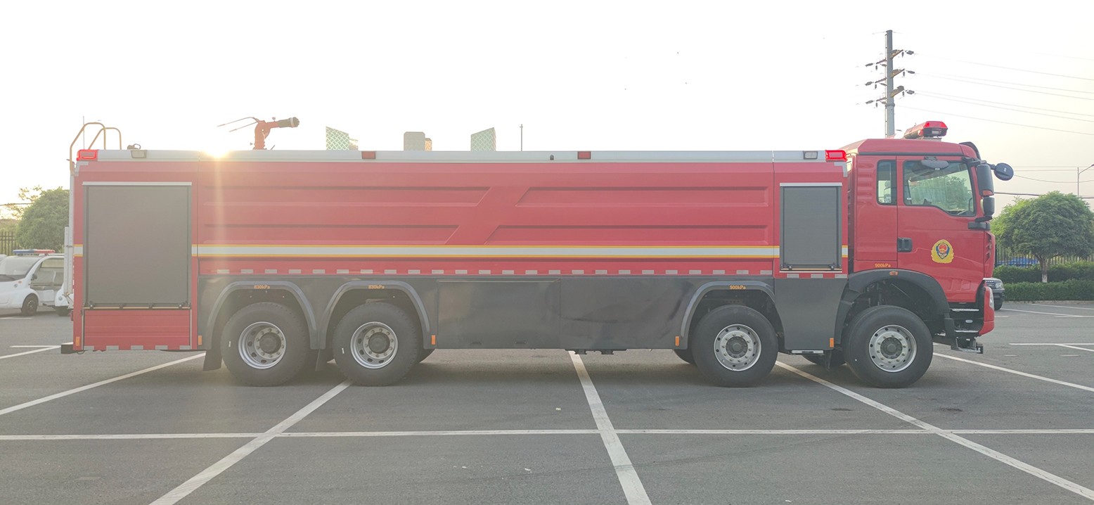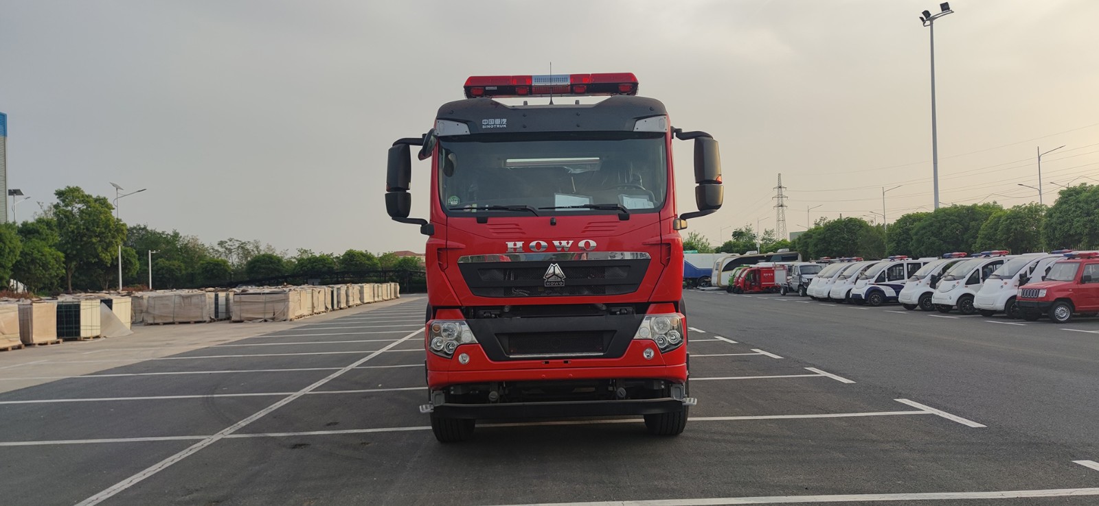 重汽豪沃25吨水罐消防车采用中国重汽集团济南卡车股份有限公司生产的二类底盘ZZ5447TXFV466MF1基础上改装而成,8×4驱动,MC11.46-61国Ⅵ排放460马力发动机,原装双排驾驶室,乘坐2人(含驾驶员),车身前部为器材箱,中部为罐体,后部为泵房。装备CB10/100型大流量消防泵,PS8/80W型消防水炮。 | |