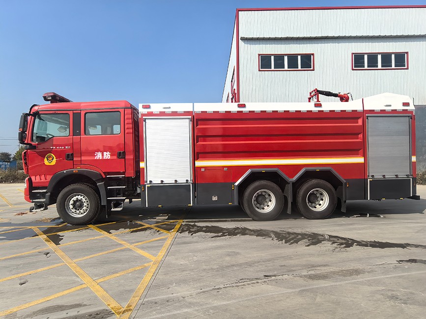 | 重汽豪沃18吨水罐消防车采用中国重汽集团济南卡车股份有限公司生产的二类底盘ZZ5357TXFV464MF5基础上改装而成,6×4驱动,MC11.46-61国Ⅵ排放460马力发动机,原装双排驾驶室,乘坐2+4人(含驾驶员),车身前部为器材箱,中部为罐体,后部为泵房。装备CB10/80型大流量消防泵,PS8/80W型消防水炮。 整车动力性能好,载水量大,持续作战能力强,技术性能处于国内领先水平,是消防救援体系中的“主力攻坚装备”,以超大储水量、强喷射能力和持续作战优势,承担大型火灾扑救、远距离供水及复杂环境攻坚任务。消防泵连续运转数小时不降频,适合总攻阶段。 | |